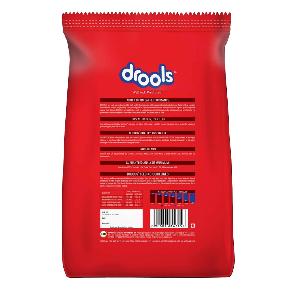 Drools Optimum Performance Adult dog food is a wholesome nutritious meal that enhances the energy level in your pet keeping them active and agile all day long. It benefits your pet with strong immunity, dental health and overall body strength. The combination of vitamins, essential amino acids, minerals, antioxidants and other important ingredients in it, provide a complete and balanced meal to your pet. This product has been through intensive research by experienced nutritionists and veterinarians where all the ingredients met stringent quality standards.